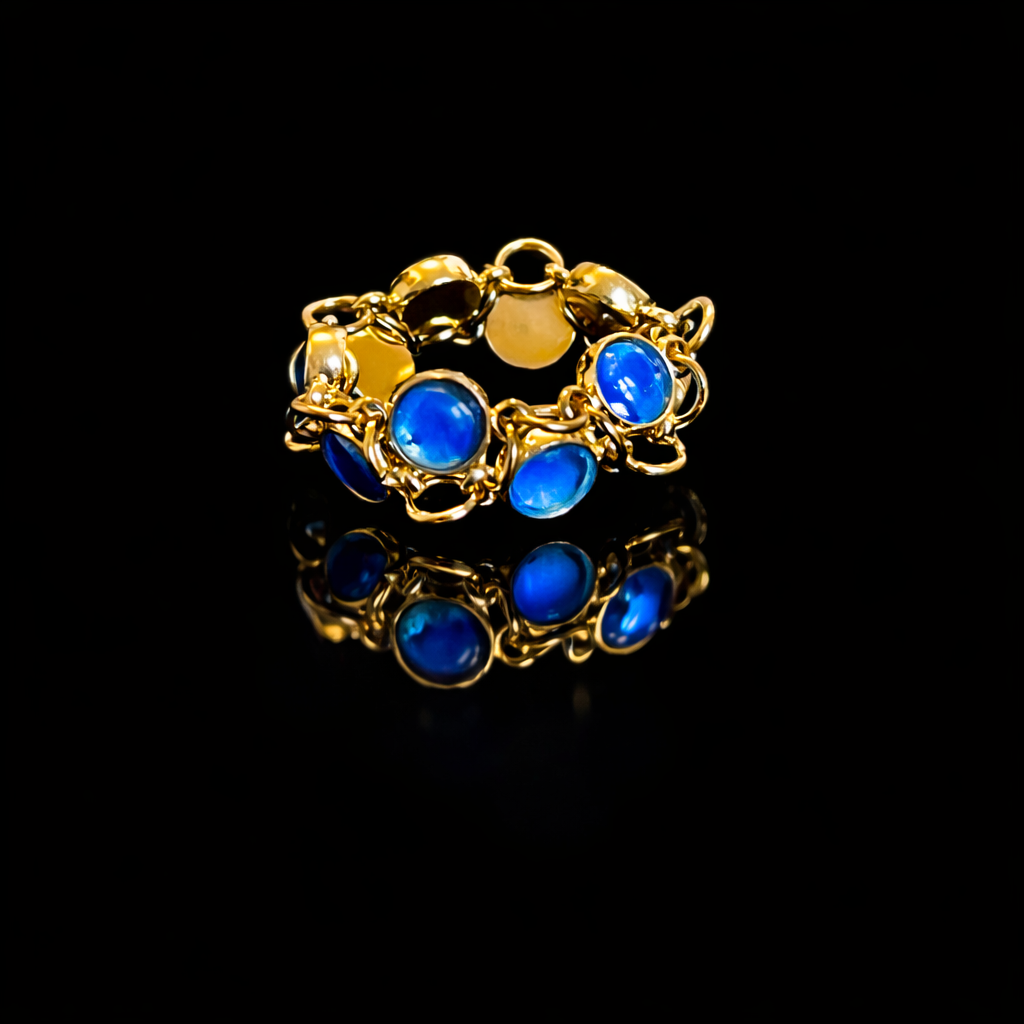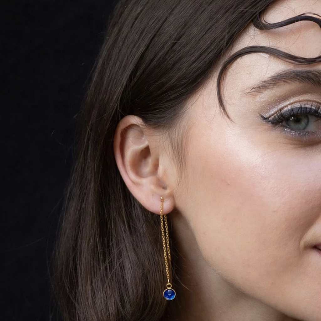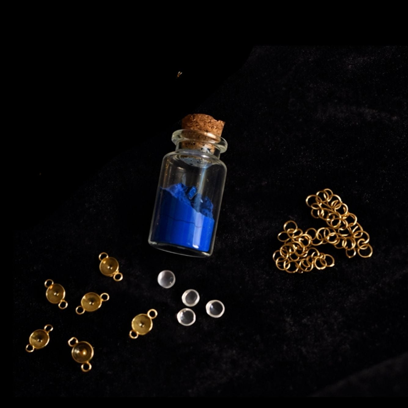 Une collection créée à partir de sertis tissés entre eux. Chaque sertis est composé de pigments naturels recouvert par un cabochon en verre.