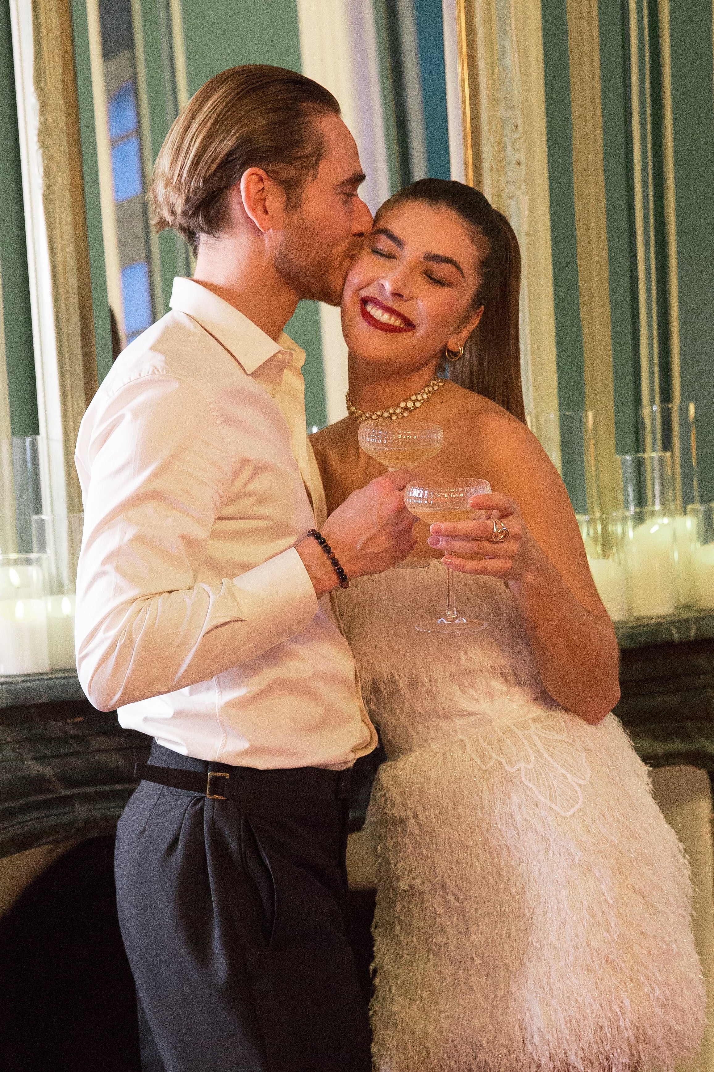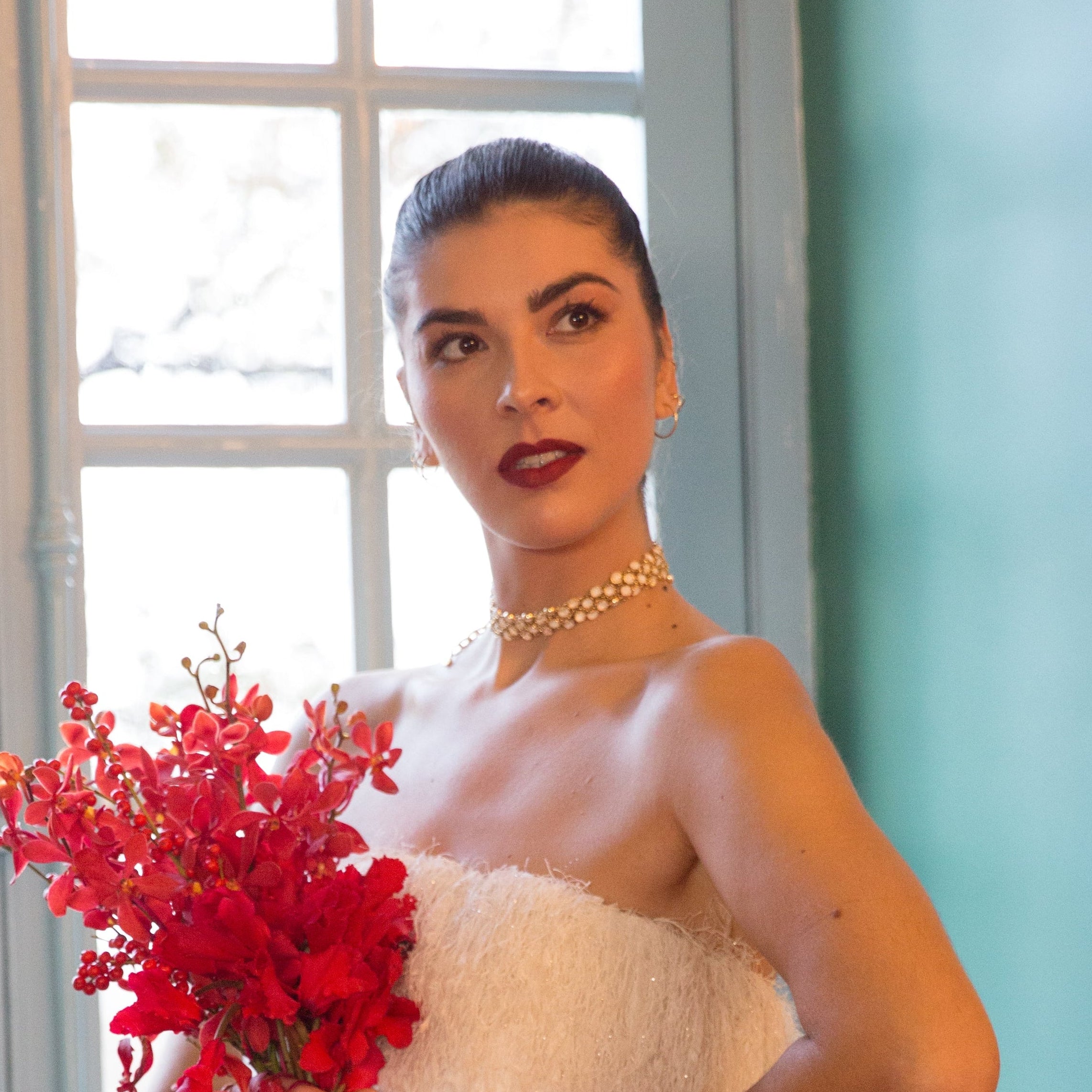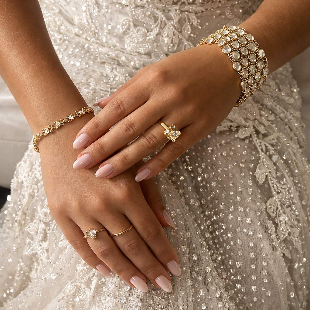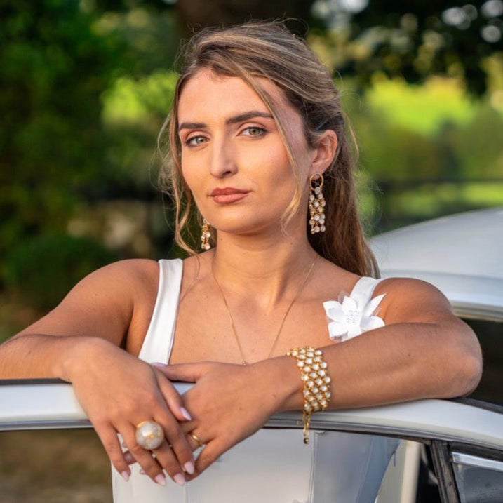 Trois paires de boucles d'oreille, Un collier, Une manchette, Une bague, Un bijou de main et la pièce maitresse : la pochette composent cette collection.