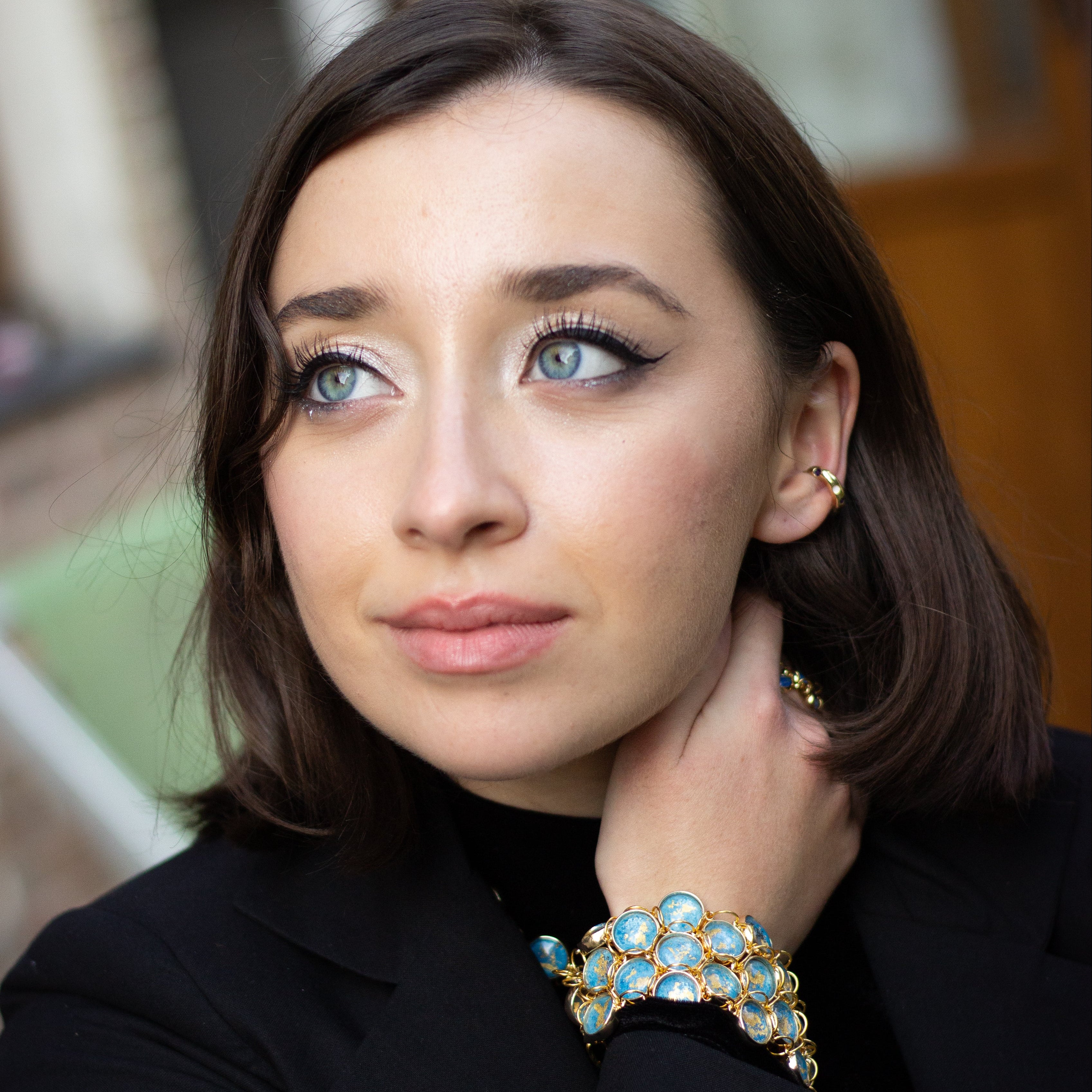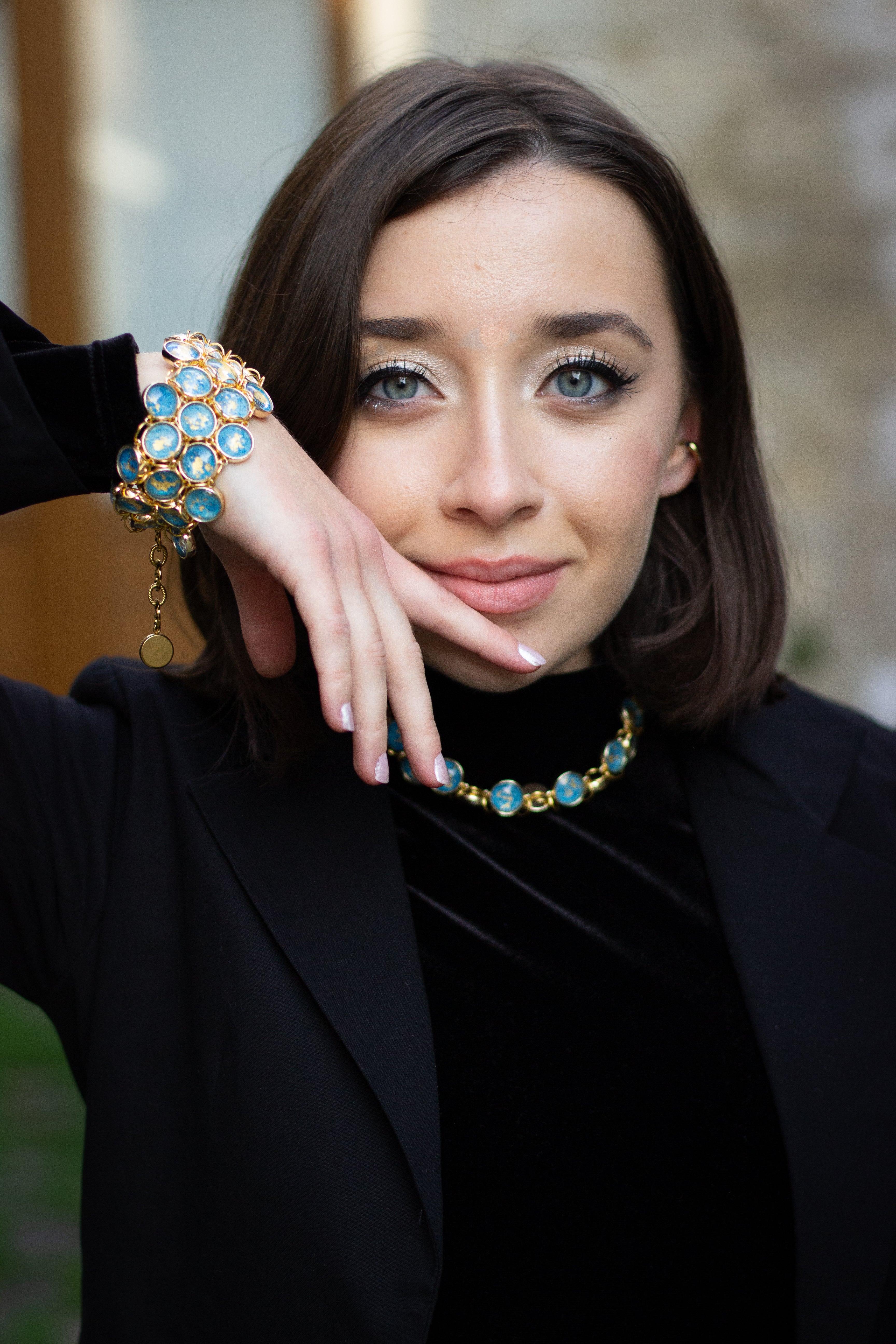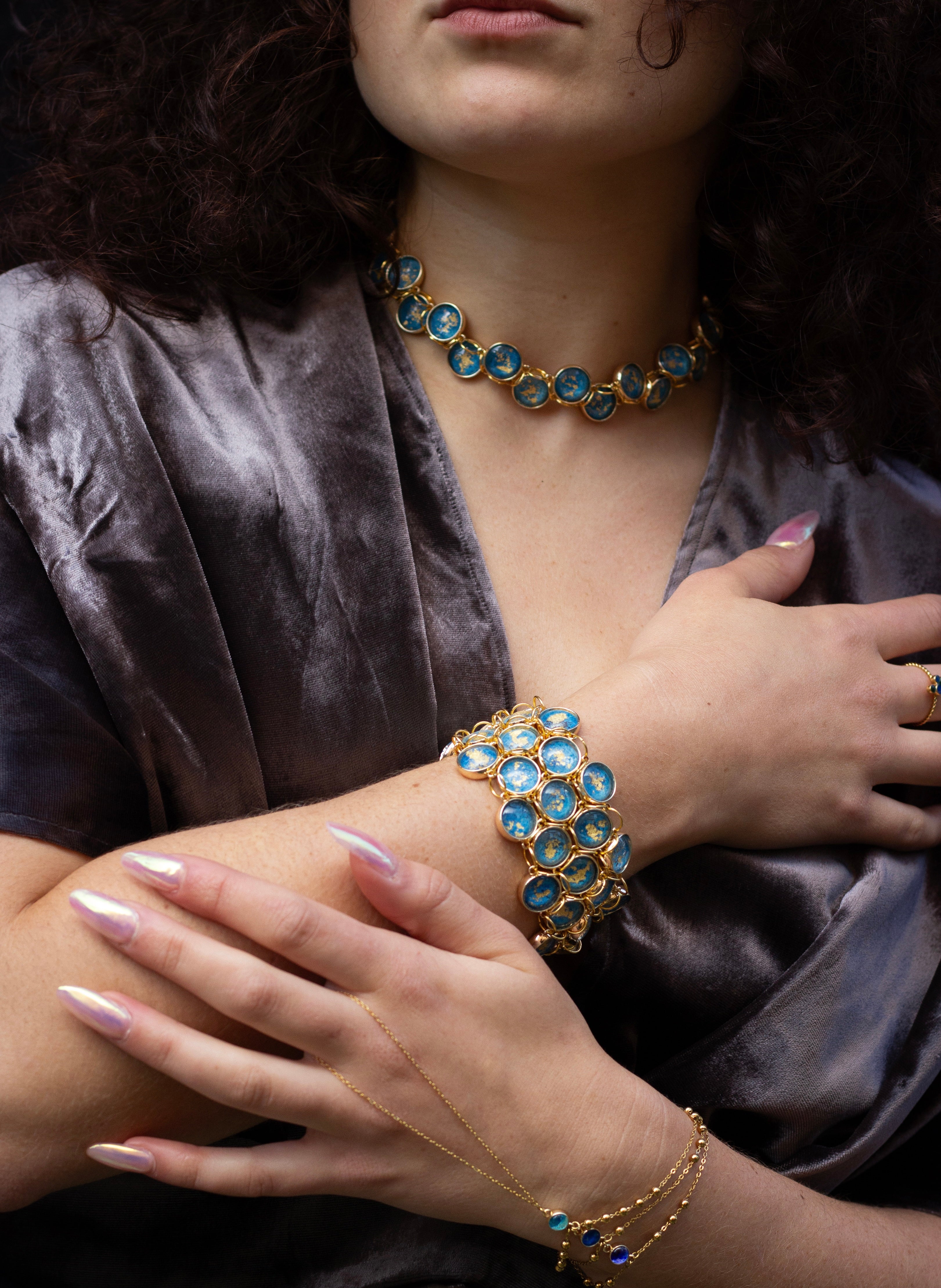 Ensemble manchette et collier en laiton plaqué or réalisé à partir de serties de pigments peints et recouverts de feuille d’or sous des cabochons de verre.