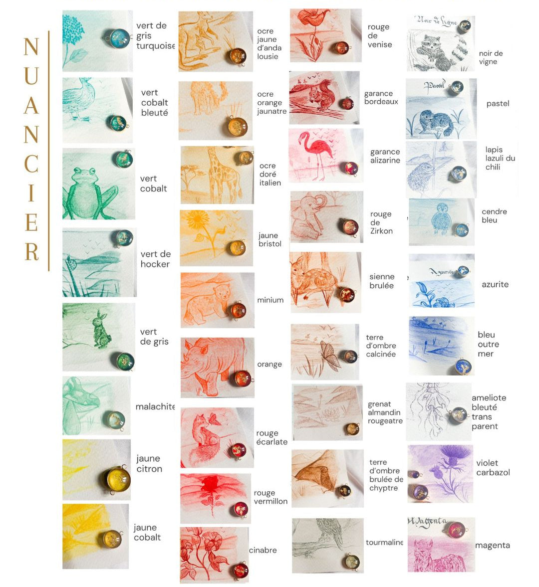 Chaque pendentif est minutieusement travaillé avec un léger dépôt de pigment naturel et fixé par un cabochon en verre.